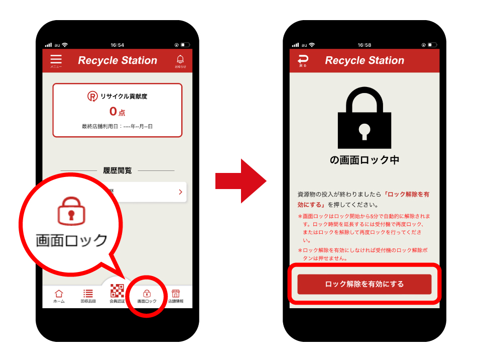 画面をロックしている場合は、アプリのサービストップ画面下にある「画面ロック」をタップし、次の画面で「ロック解除を有効にする」をタップします。